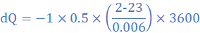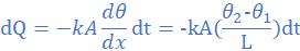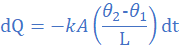 k=1.0 W/mK, A=0.5 m2, θ2=2 0C, θ1=23 0C, L=0.6 cm=0.006 m, dt=1 h=3600 s