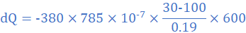k=380 W/mK, A=0.785 cm2=785×10-7 m2, θ2=30 0C, θ1=100 0C, L=19 cm=0.19 m, dt=600s